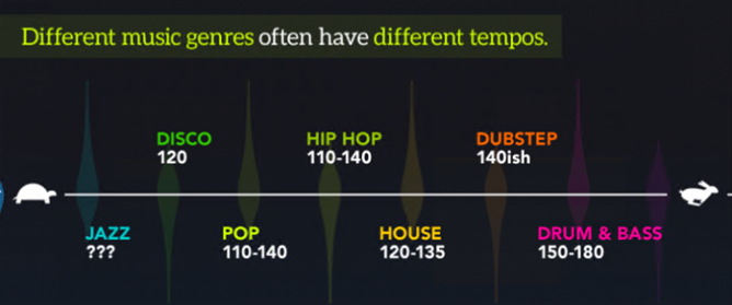 La función setTempo() le permite establecer el tempo general del proyecto. El tempo es la velocidad a la que se reproduce una pieza de música. Cambiar el tempo de un proyecto permite crear diferentes estilos de música. ¡Intenta cambiar el tempo de tu función setTempo cambiando el número en el bloque y observa qué sucede! Asegúrate de que sea un número entre 45 y 220. A continuación se presentan algunas sugerencias de tempos que puedes usar.