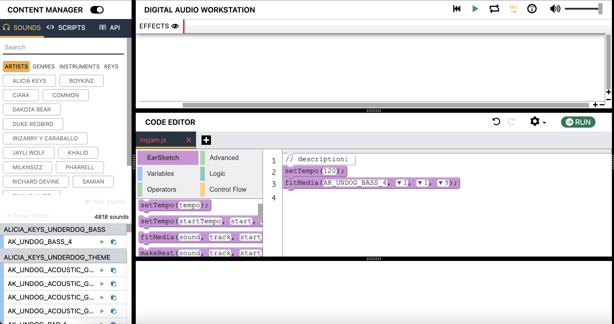 fitMedia()es la columna vertebral para hacer música en Earsketch. Usaremos esta función mucho, así que si tienes alguna pregunta sobre su uso, ¡por favor pregúntanos!