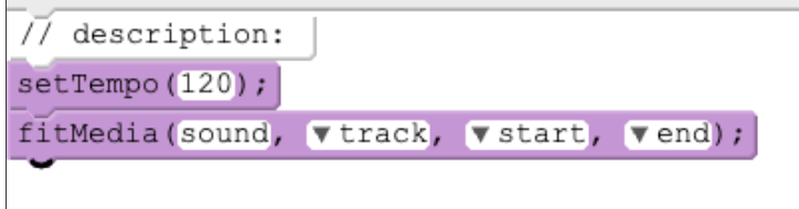 fitMedia()para insertarlo debajo del bloquesetTempo. - Puede que notes que cuando se agrega el bloque, Earsketch produce algunos textos de marcador de posición que tendremos que reemplazar más adelante. Estos textos de marcador de posición también se conocen como