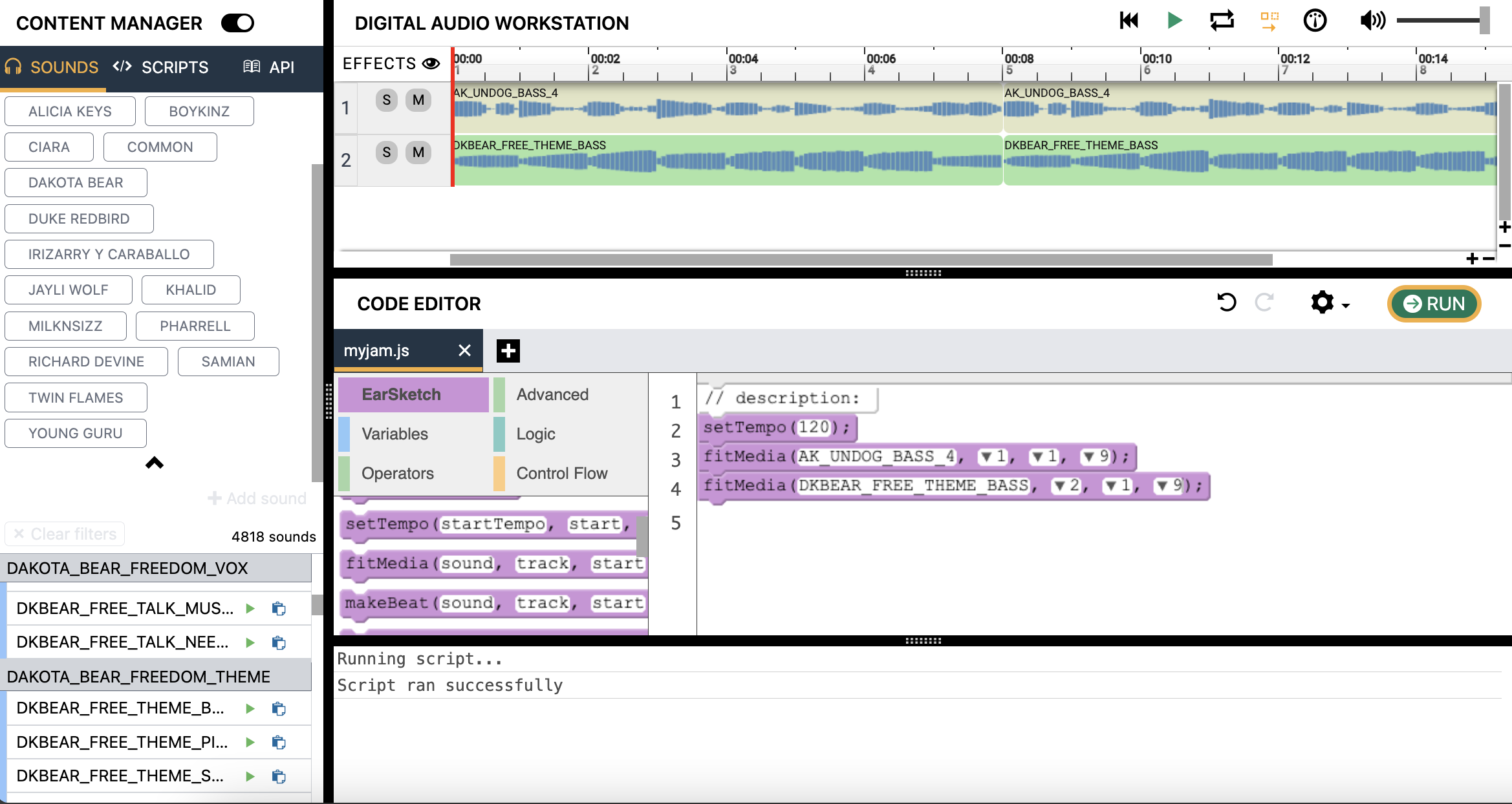 Ahora que has aprendido cómo agregar sonidos a Earsketch, ¡intentemos hacer una canción! Ya deberías tener un clip de audio en Earsketch, pero las canciones están compuestas por varios instrumentos, así que necesitamos agregar más clips de audio.
