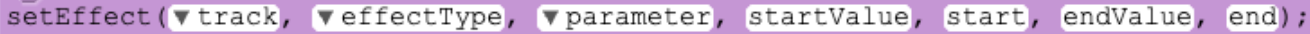Esta versión de setEffect nos permite realizar automatización en una pieza específica de nuestra canción. La automatización es una forma de cambiar el valor de un efecto con el tiempo. Una forma de utilizar la automatización es hacer que una canción se desvanezca. Para hacerlo, debemos ajustar el volumen del parámetro GAIN en el tipo de efecto VOLUME con el tiempo. Por ejemplo, si definimos nuestro startValue en -60 dB y nuestro endValue en 0 dB, sonará como si nuestra canción se estuviera desvaneciendo con el tiempo. Para ajustar el punto de inicio y la duración del efecto, especifica el start y el end.