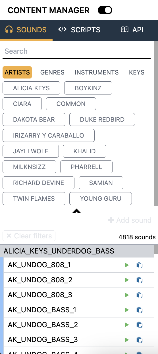 Sonidos. Es la ubicación central para todos los sonidos precargados que ofrece Earsketch. En el navegador de sonidos, puedes filtrar qué sonidos aparecen según los artistas, el género o los instrumentos.