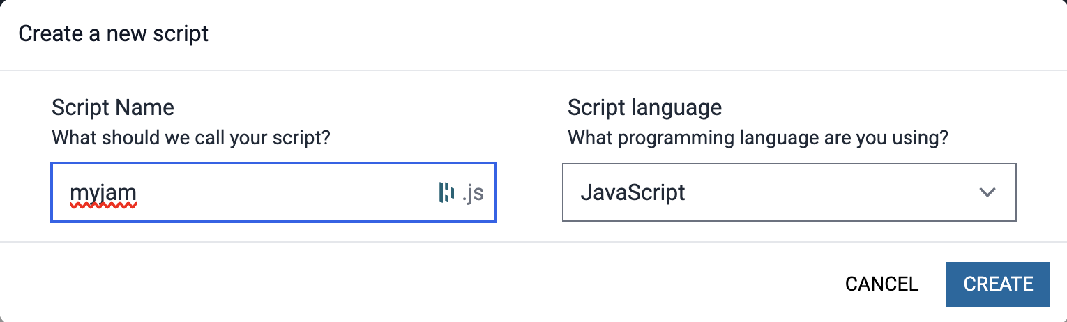 - Ingresa myjam (o cualquier otro nombre que desees) como el nombre de tu script, y cambia el lenguaje de programación a JavaScript. Haz clic en el botón Crear para crear tu script (el archivo donde se colocará tu código).